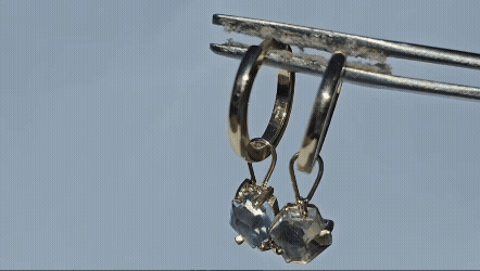These earrings feature two one-of-a-kind, hand-cut sparkling, light blue sapphires from Montana. These sapphires are sisters, not twins as they are each a little bit different. One-of-a-kind.